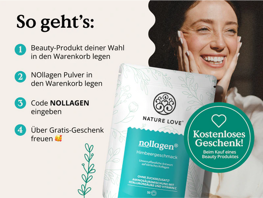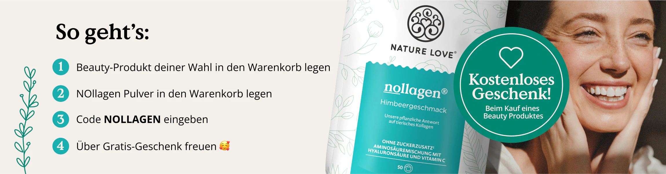 *Gültig bis zum 30.03.2025, 23:59 Uhr auf alle teilnehmenden Produkte. Das Geschenkprodukt "NOllagen" muss selbst zum Warenkorb hinzugefügt und der Rabattcode NOLLAGEN im Checkout eingegeben werden. Versandkosten sind vom Rabatt ausgeschlossen und die Aktion ist nicht mit weiteren Rabatten oder Aktionen kombinierbar. Nicht anwendbar auf Abonnement-Bestellungen. Keine Barauszahlung. Nur 1x pro Bestellung einlösbar. Nur solange der Vorrat reicht.